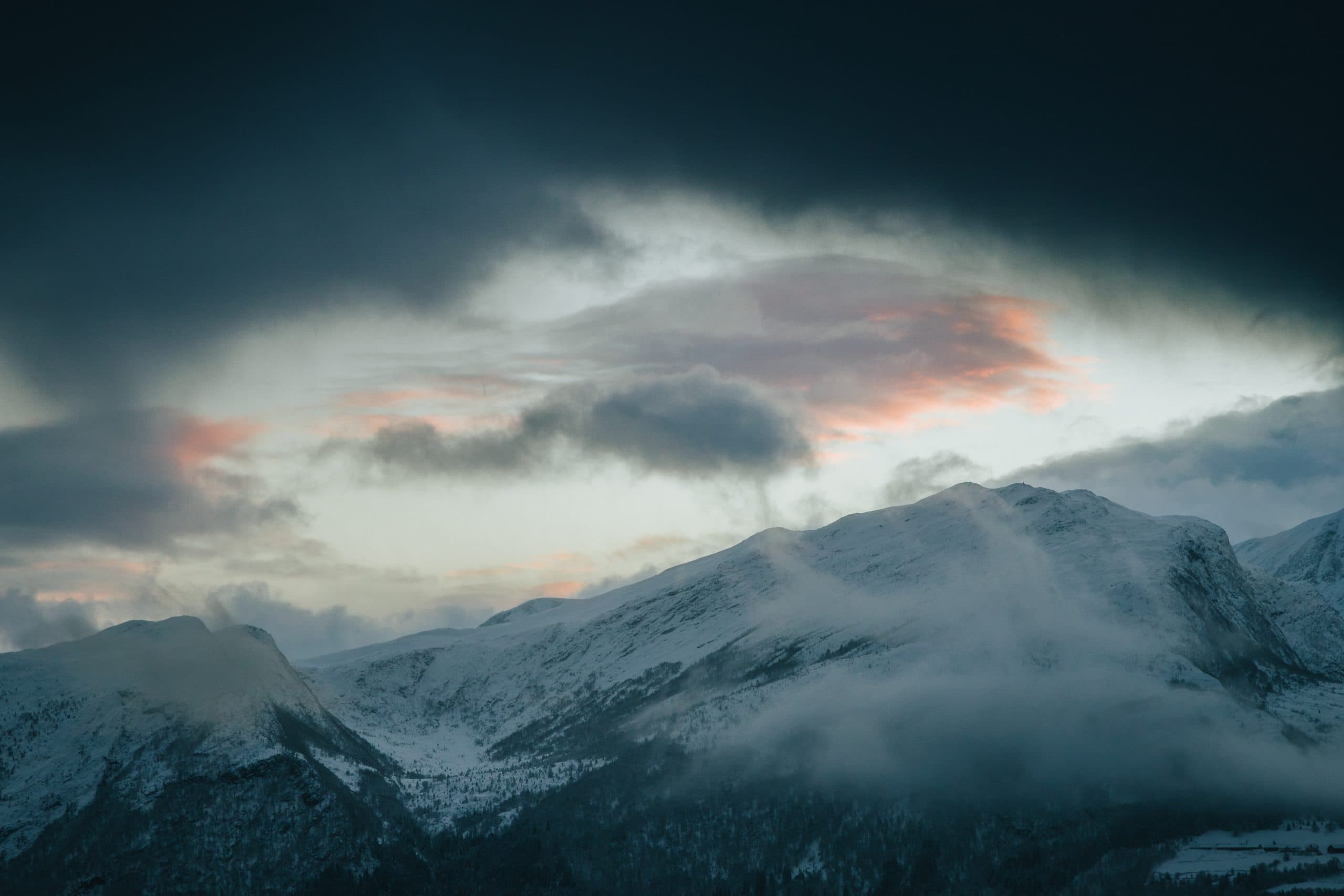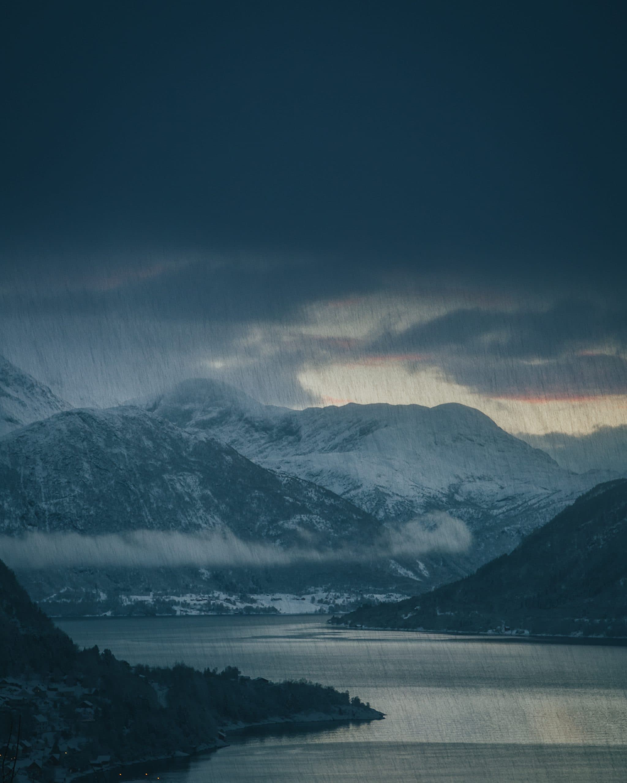 As I looked around trying to capture some detail shots of the mountains on the other side of the fjord, I noticed a dark shadow in the upper part of the viewfinder. I thought I had gotten something on my lens or something, and put the camera down to see what was going on. Turns out the dark shadow was a black, fast-moving cloud. Within less than five minutes the scene went from winter wonderland, to dramatic and foreshadowing cloud cover, finishing in heavy snowfall and wind.